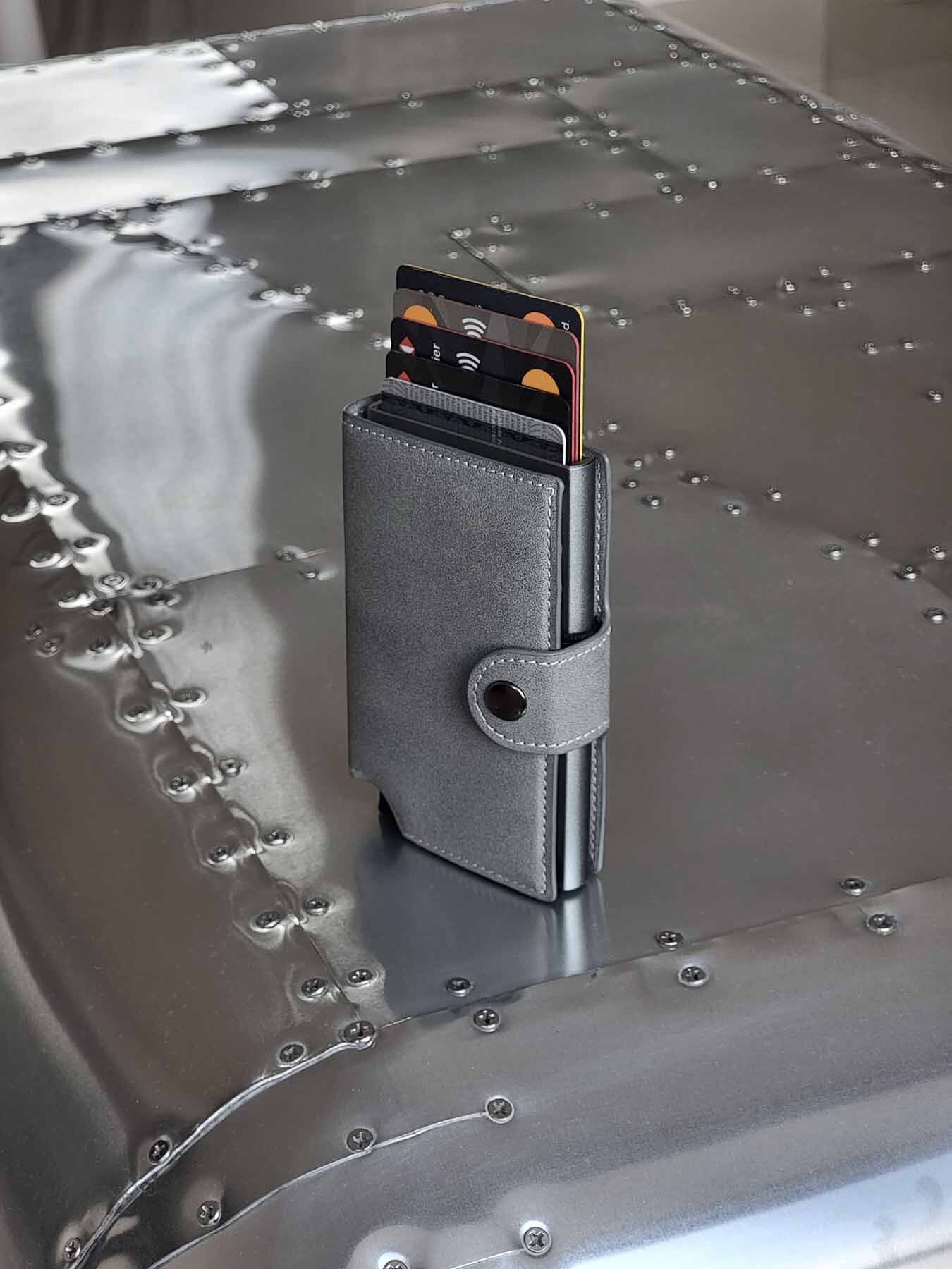 Компактный картхолдер изготовлен из веганской замши и алюминия с функцией RFID-защиты и механизмом для быстрого доступа к картам. Вмещает до 9 карт стандартного формата, оснащен эластичной лентой для наличных.